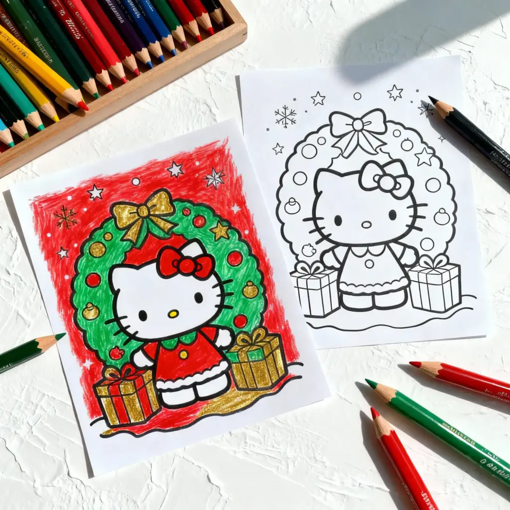 Find free Christmas art pages. Hello Kitty makes them exciting. You can download many designs. Each page is ready to color. Children enjoy these holiday themes. They are easy to print at home. Use crayons or bright pencils. Enjoy hours of coloring fun.